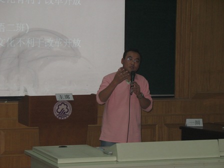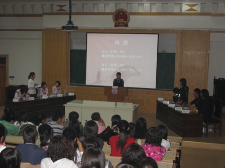 来自正方日语一班的辩手从立论到反驳,表达流利,思维敏捷。四位女辩手“巾帼不让须眉”,言辞巧妙而犀利。她们对辩题进行了深刻的剖析,句句切中要点,显得从容而有力度。正方强调要批判地继承传统文化,去其糟粕,取其精华,汲取传统文化中的优秀部分来促进我国的改革开放。而反方四位选手表现也相当出色,他们破题立论,举出了大量例子来支持自己的论点,从陈词到提问,显得沉着冷静而又信心十足。他们抓住传统文化中的尊卑观念等一些封建思想会给改革开放的建设带来消极影响之这一方面,突出本方观点。在自由辩论环节,正反双方你来我往,唇枪舌剑,精辟的言论,激烈的对攻,精彩的表现把现场观众带入了辩论赛的高潮,掌声、叫好声此起彼伏。