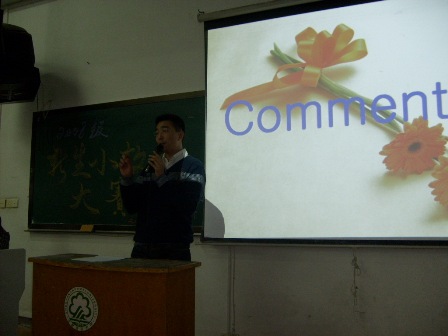 比赛接近尾声,英语一系的张林老师就各位参赛选手的临场表现和参赛题材进行了精彩的点评,以探讨如何练好英语口语为导入,就本次小故事大赛选手们集中存在的语音问题予以纠正,语言诙谐却一语中的、极具有建设性,极大启发并开阔了大一新生们对练习英语口语的思路,直指同学们的关键问题之所在,使所有在场同学都受益匪浅。由此,他们充分地意识到练习英语口语是一项长期坚持、不断积累的过程只有在平时真正做到如张林老师说的:“practice ,practice and practice”我们的口语水平才会更上一层楼。同时,张林老师的激励也让2008级新生们更加积极主动地投入到专业英语学习中来。