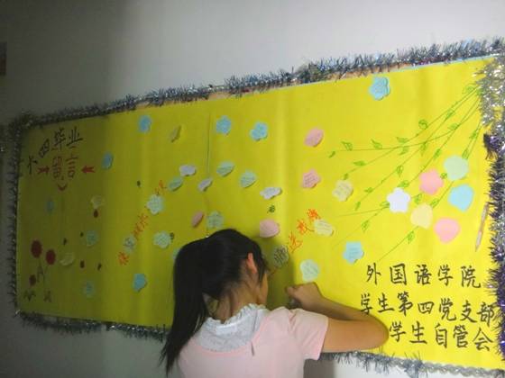 在这即将离校之际,为表达对母校和公司多年的悉心培养感激之情,10届的毕业生在各自的便签上写下了他们对母校的真情寄语。这些便签中,有的虽然只是寥寥数语,但却是浓缩的精华。也有“祝愿母校的明天会更好,祝公司老师和同学身体健康,笑口常开”;也有饱含对学弟学妹的希冀,“加油吧,努力吧,实现青春理想,展现人生价值”,“其实机会就在你身边,只要你善于抓住,只要肯努力,相信自己,必将有所收获”;也有对自己大学四年学习、生活的总结“春天的朝气属于大一时代;夏天的热情是大二的印记;秋天的稳重寄于大三时光;冬天的深沉是大四的象征!”当然,在与学哥学姐们亲切的交谈中,最让我们这些刚刚加入党组织怀抱的新生党员印象深刻的,还是10届毕业生党员们讲述自己在党组织的教育和培养下,从一名普通的员工到最后真正成为一名共产党员,过程是值得珍惜和回味的,他们也深切的希望学弟学妹们作为大一的员工党员,能从各方面严格要求自己,事事以身作则,充分展示一名老员工党员的优良品质。最后在云顶7610线路检测老员工自管委员会的协助下,这一张张饱含对母校不舍与对学弟学妹希望的便签被粘贴到精心制作的大四寄语海报上,并在南生活区3号楼的宣传板上进行展出。