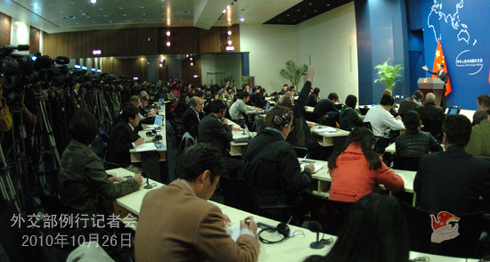 2010年10月26日,外交部发言人马朝旭主持例行记者会。