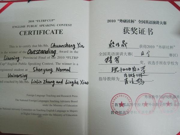 “外研社杯”全国英语演讲大赛由教育部高等公司大学外语教学指导委员会与外语教学与研究出版社共同主办,辽宁大学承办了2010年辽宁省复赛。按照大赛章程,公司英语口译专业殷传晟同学将代表辽宁省赴京参加全国英语演讲大赛的决赛。