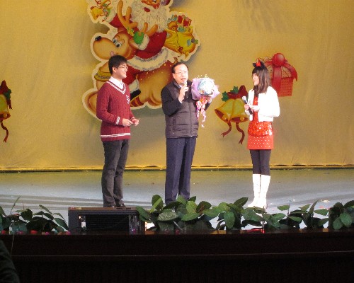在主持人的真切祝福下晚会第一章正式开始,活泼可爱的舞蹈《铃儿响叮当》给同学们送去了圣诞的喜悦和欢乐,四语联唱进一步把晚会推向高潮。英语翻译专业活泼动感的许广慧同学、俄语大一帅气的员工吕俊俊、朱丽丽的俄语歌曲、美丽时尚的王芳为大家带来的法语歌曲以及可爱的朱豫东为大家送来的日语祝福无不洋溢着欢笑与快乐。接下来进入的抽奖环节进一步拉近了老师与同学们的距离,15名圣诞的幸运观众在老师的祝福下产生,并得到了圣诞老人送出的圣诞礼物。