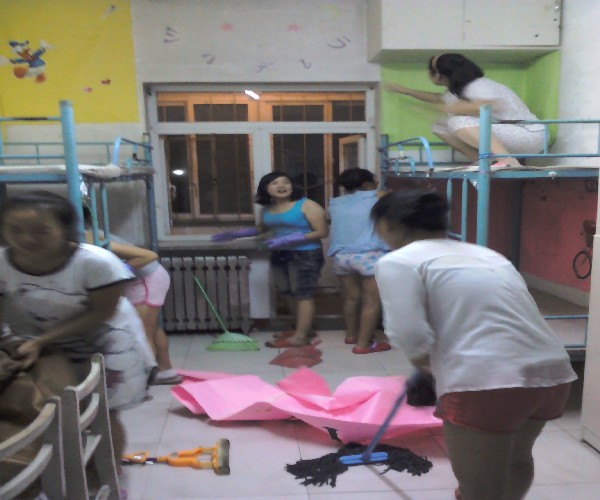 打扫寝室工作首先从3号楼开始进行。2011级每班以小组的形式了开展清理工作。清理工作十分困难繁琐,同学们需要将寝室墙上的墙纸、双面胶以及挂钩全部清理干净。由于墙上的胶纸粘性很大,同学们需要用钢尺、砂纸等工具将墙面清理干净。尽管如此,同学们仍发扬不怕脏、不怕累的志愿精神将寝室的墙面打扫的干干净净。除了墙面之外,寝室的地面、桌椅、玻璃、床铺等地方都需要大幅度的清扫,然而同学们并没有因为太多的打扫工作而叫苦不迭,反而干劲十足,将阳台玻璃擦拭得十分明亮。终于,经过同学们认真刻苦的打扫之后,宿舍的卫生有了明显的改善,整个宿舍焕然一新。