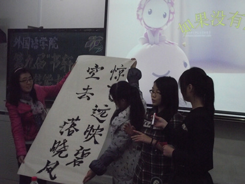 经过激烈的角逐,本次比赛共有16名选手进入了决赛,分为书法组与绘画组。本次比赛共分为三个环节,第一环节“秀自我”即自我介绍环节,选手们通过轻松幽默的方式向各位老师以及在场的每一位选手展现了自己的风采,让大家对他们的魅力有所了解;第二环节“展风采”,16名选手分成了6个小组,逐一为大家带来了精彩的表演。第一组同学表演的是诗朗诵《热爱生命》,慷慨激昂,感情饱满,同时,另一位同学现场用毛笔书写“热爱生命,走向未来”八个大字,字体落落大方,获得了大家的掌声;第二组两位同学的为大家带来幽默俏皮的舞蹈;第三组同学同学带了相声《生财无道》,语言诙谐幽默,动作生动形象;第四组同学表演了双簧,默契十足,博得大家阵阵笑声;接下来的第五组可谓是将第二环节推向了高潮,其表演的小品《试戏》让大家从头到尾捧腹大笑,其精湛的表演与十分幽默的语言获得了一致好评;最后一组同学带来小品《东北人在纽约》,讲述了异乡相逢的温暖。大家精彩的表演在将座的每一位深深吸引。第三环节“拼技能”,可谓是本场比赛最有看点的,经过前两轮的角逐,共有八位选手进入了第三环节,为第三环节的要求是——现场完成书画作品。第一位完成的刘昕慧同学带来的是一副硬笔小楷,手法棱角分明,刚劲有力;随后法语班的张迪同学带了了淡雅的素描作品《雪》,在她的手下,抽象洁白的雪被具体的展现了出来,令人赞不绝口;接下来选手的作品陆续展示在大家面前,书法组于晓如同学的作品挥洒自如,令人称赞,绘画组吴宛宇的剪纸更是惟妙惟肖。最后,宁宁老师对本次比赛作了总结,给出了较高的评价,随着结果的揭晓,本次比赛在掌声中落下帷幕