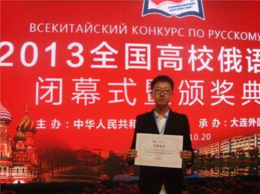张克同学荣获“2013全国高校俄语演讲大赛高年级组二等奖