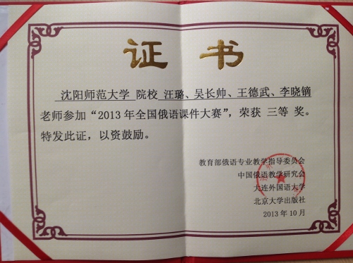 在本次大赛闭幕式上,还进行了“2013全国俄语课件大赛”的颁奖仪式。“2013全国俄语课件大赛”由教育部俄语专业教学指导委员会、中国俄语教学研究会、大连外国语大学、北京大学出版社联合组办。云顶7610线路检测俄语系教师汪璐及其课题组成员(吴长帅﹑王德武﹑李晓镝)荣获“2013全国俄语课件大赛三等奖”。