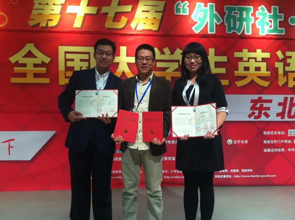 陈晚月同学(右1)、李天泽同学(左1)获得2013年东北地区老员工英语辩论赛一等奖,与指导教师合影