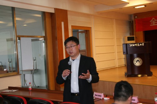 最后,为了让同学们对全国英语口语测评大赛有更进一步的了解,全国英语口语测评大赛辽宁省执委会主任委员卢英凯先生为大家详细介绍了“2014全国口语测评大赛”活动说明。他分别从英语口语等级考试的规则和方式,考试所用的软件使用方法和使用情况,以及社会对英语口语等级考试普及程度等方面为大家做了详细的介绍,在场的同学们后都兴趣盎然,跃跃欲试。