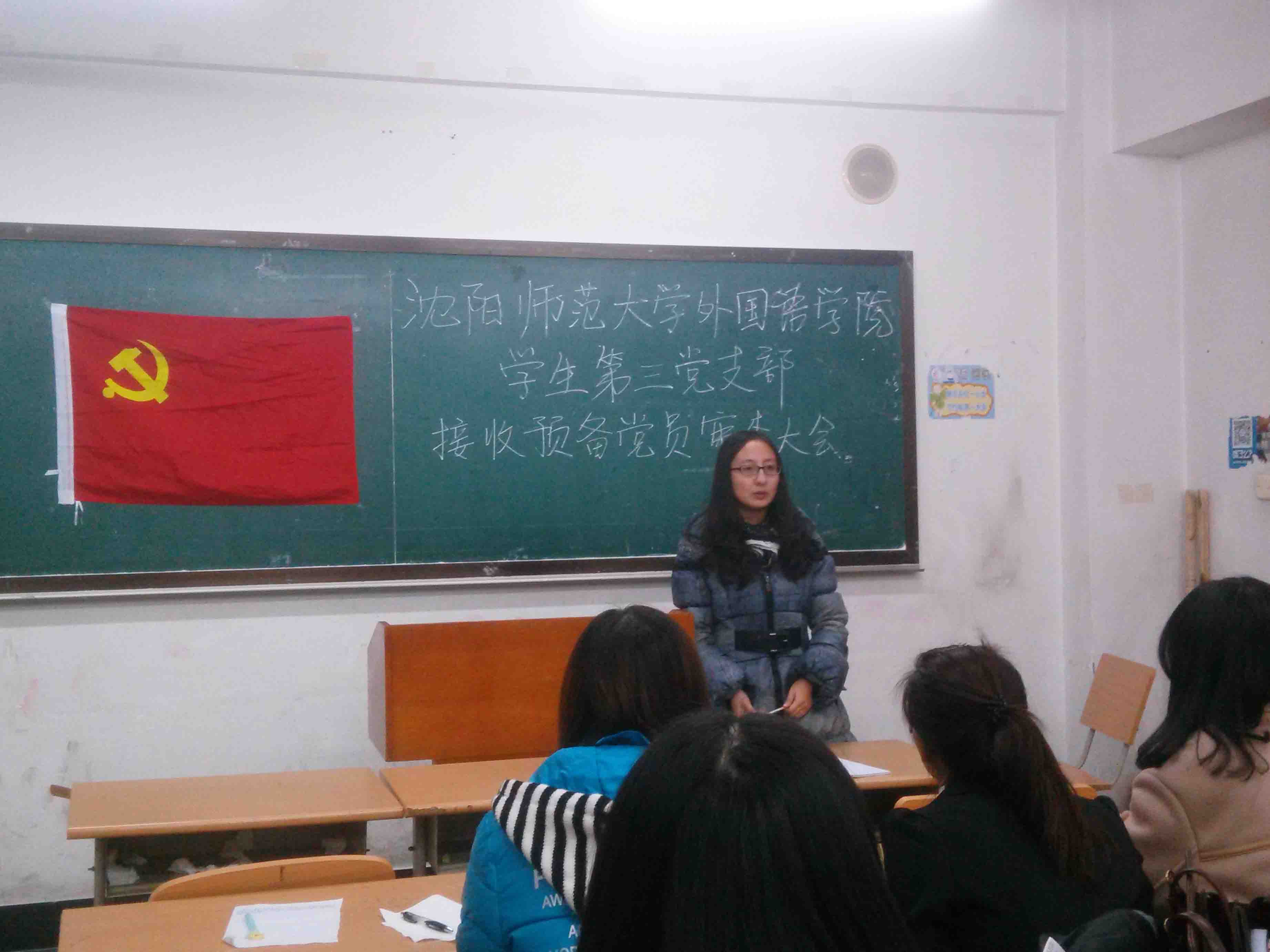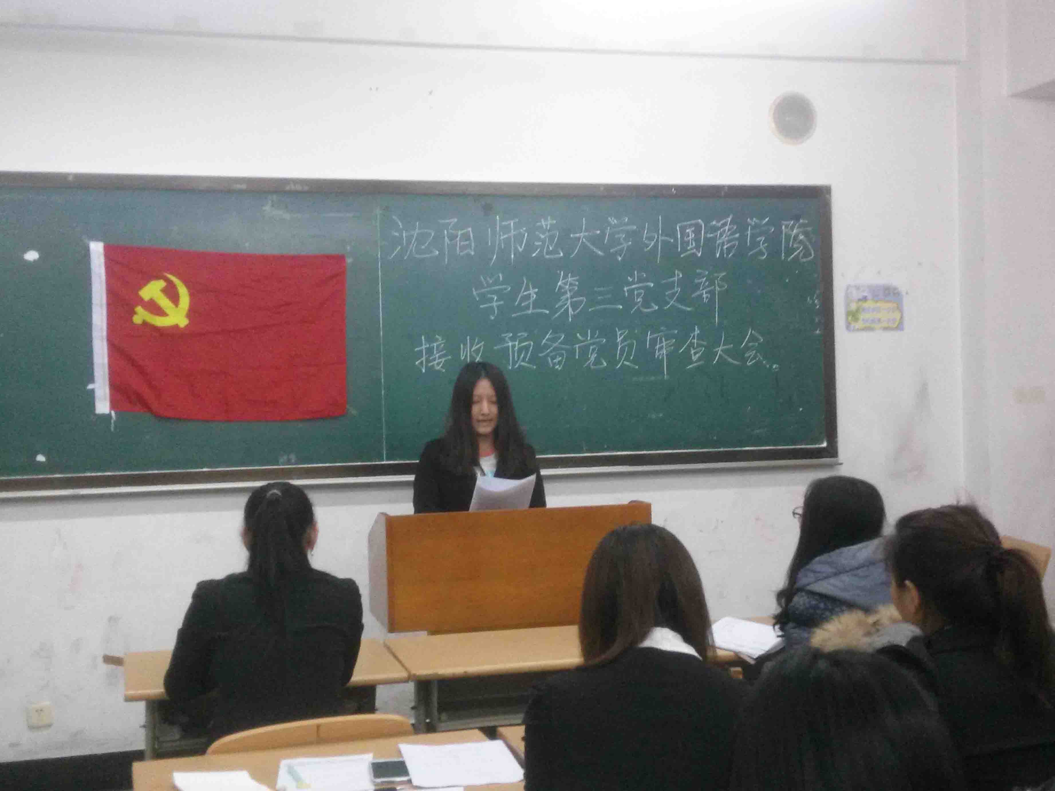 2014年12月3日晚,外国语公司员工第三党支部接收预备党员大会在汇文楼211教室召开。员工第三党支部书记、12级专职辅导员柳林老师,员工第三党支部全体正式党员,2012级全体预备党员及积极分子代表参加此次大会。