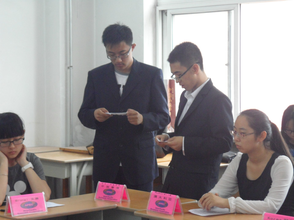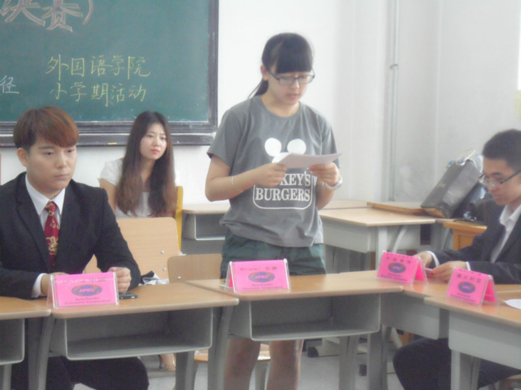 6月25日上午8点30,模拟APEC大会决赛在汇文楼501教室准时拉开帷幕。出席本次活动的有公司张蓉老师、谢凝老师、冯帆老师、王亮老师。