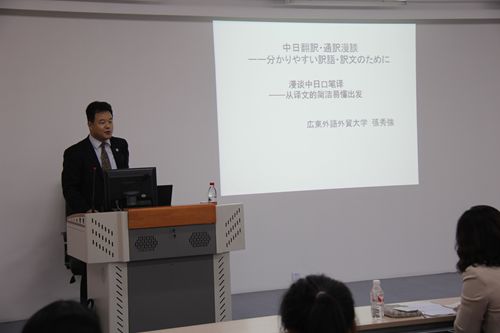 报告中,张秀强副教授从“为什么要翻译”的命题切入,深入讲解了中日口笔译的技巧和研读方法。他指出翻译过程中需要注意的问题;介绍了同声传译的分类和同声传译译员素养要求;与大家分享了自己的翻译心得,并就自己在口笔译实践工作中遇到的问题进行了详细的剖析。