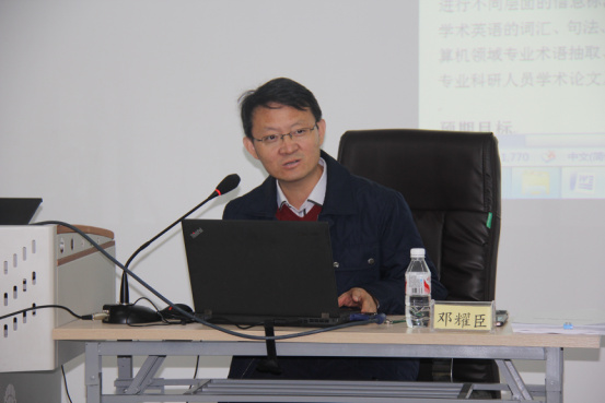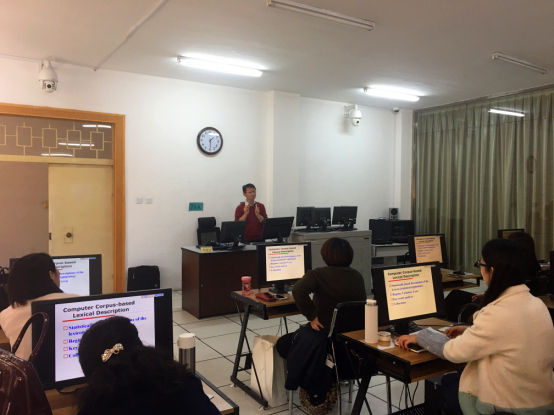 论坛分上下午进行。上午的论坛题目为《大型学术英语语料库计算机科学分库建设原则》,邓耀臣博士对语料库方法做了更加具体深入的解释,以大型学术英语语料库计算机科学分库建设为例,与各位师生探讨了语料库建库的过程及原则。邓耀臣博士还举例讲述了语料收集和语料标注的具体步骤。下午的论坛邓耀臣博士先系统讲述了基于语料库的词汇研究情况,并就借助语料库分析主题词等词汇现象带领师生们进行了上机实操练习。