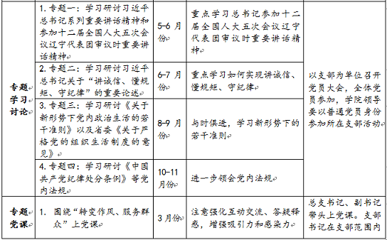 专题 党课 | 1.围绕“学习党章党规”上党课 | 6月份 | 进一步领会党章党规的核心内容 | 总支书记、副书记带头上党课。支部书记在支部范围内讲党课。 邀请校领导、思政课党员教师、先进模范、身边榜样讲党课 |