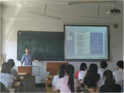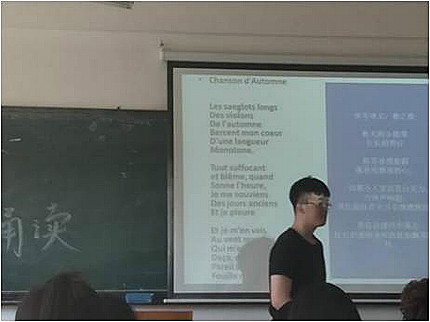随后,王欣桐老师以《秋之歌》为例,进一步讲解法文诗歌的鉴赏,并播放了一段《秋之歌》的朗诵音频,并请同学们上台朗诵。