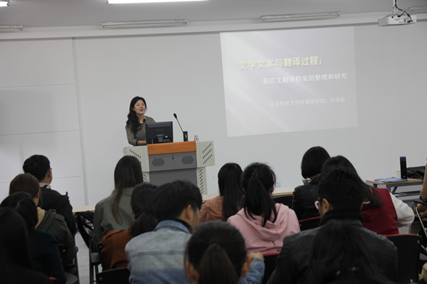 许诗焱教授做了题为《译者—作者互动与翻译过程——基于葛浩文翻译档案的分析》的学术报告。报告中,许教授以俄克拉荷马大学中国文学翻译档案馆所收藏的葛浩文、林丽君翻译《推拿》过程中与作者毕宇飞之间的邮件为基础,将译者所阅读的原文、译者在阅读原文过程中所提出的问题分别做出了回答,并同最终版的译文结合起来分析展示了译者与作者在翻译过程中的意义探讨、过程交流和矛盾求证。许教授通过具体的邮件内容展示和中英对译的对照进行分析,给在场的师生留下了深刻的印象,使各位师生进一步深化对翻译这一学科的理解。