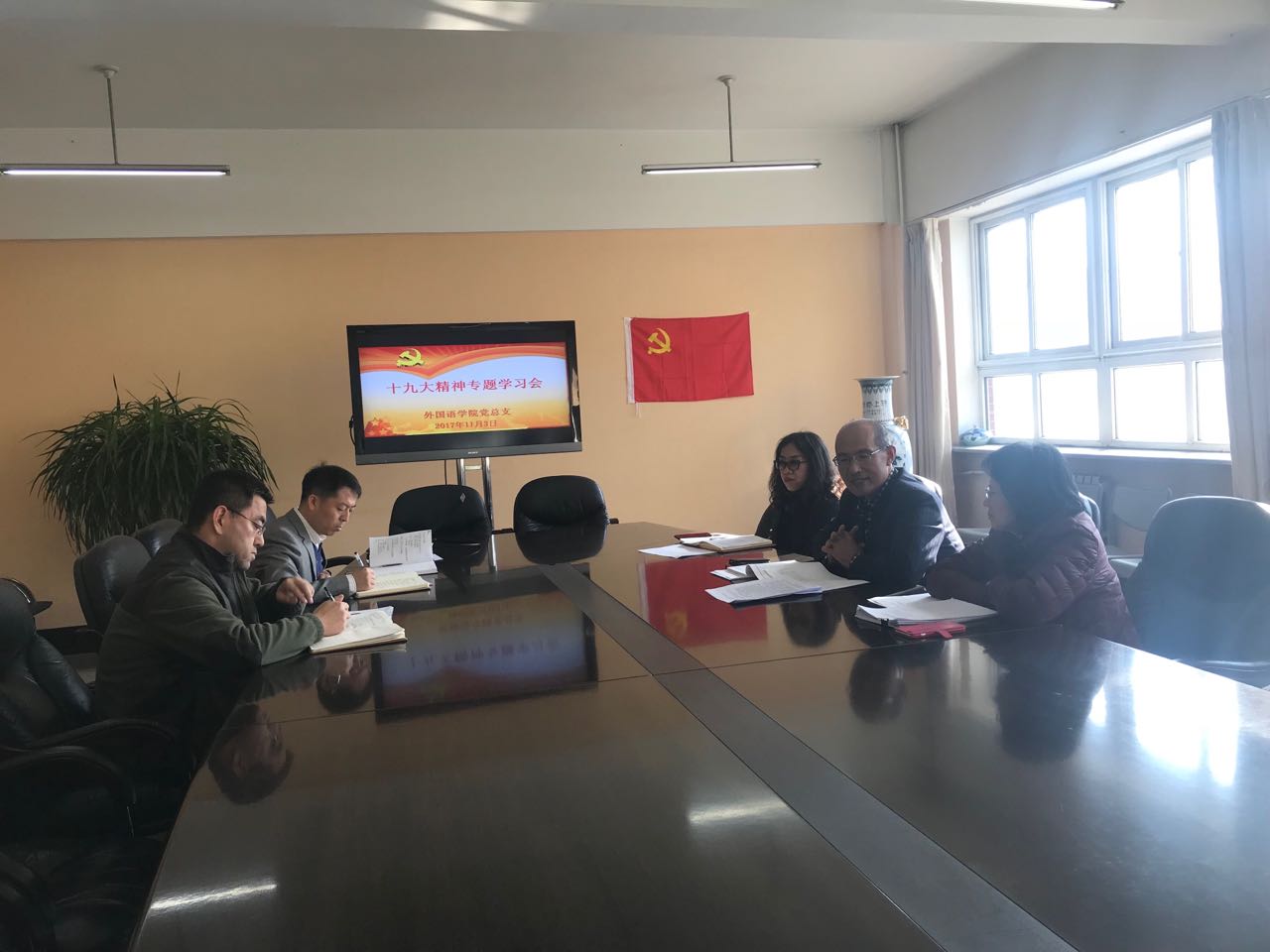 2017年11月3日下午13:00,外国语党总支委员在公司会议室召开学习会,集中学习党的十九大精神。