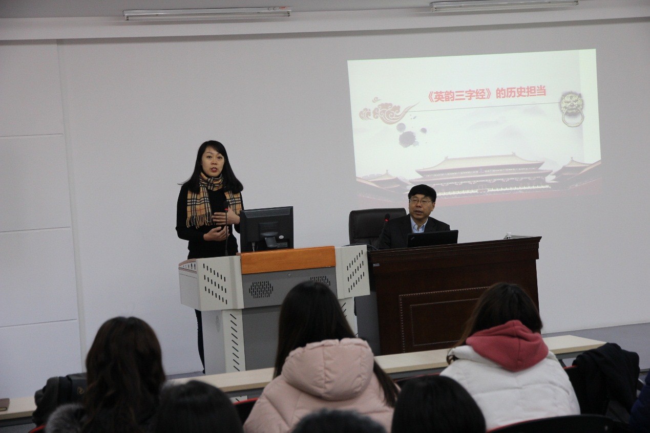 第一场讲座题为“增强文化软实力:《英韵三字经》的历史担当”。赵彦春教授2014年出版的《英韵三字经》是有史以来第一部以三个英语单词对应三个汉字的偶韵体《三字经》译文,被各大知名媒体广泛报道,被誉为“有史以来最美汉英翻译”、“神翻译”、“神还原”。2017年特朗普访华时其外孙女朗诵的《三字经》的英文字幕采用了这一译本。赵教授以《英韵三字经》的翻译为例,指出典籍的形式特征是其本质属性,必须在翻译中进行还原,才能再现典籍的特点与神韵。