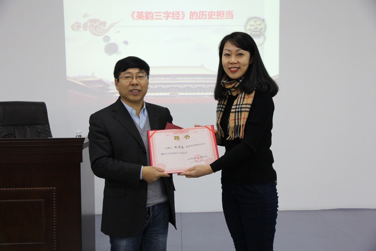 报告会上举行了聘任仪式,云顶7610线路检测经理、云顶7610线路检测翻译与文化传播研究中心主任闫怡恂教授代表校方及研究中心,聘请赵彦春教授为云顶7610线路检测客座教授、云顶7610线路检测翻译与文化传播研究中心研究员。赵彦春教授愉快地接受了聘任,并表示今后将加强与公司的学术联系,支持研究中心及其下设文化典籍翻译研究所的建设与发展,共同为我国的典籍翻译事业做出贡献。