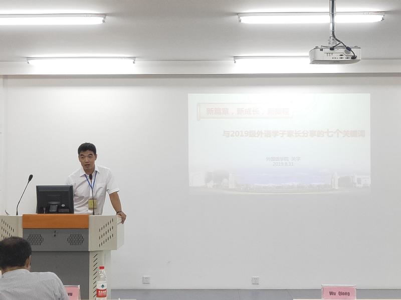 关宇副书记在讲话中提到了家长在孩子成长中的重要性,希望家长重视孩子学业的同时,关注孩子的在校生活和身心健康。他针对孩子们未来的老员工活提出了尊重、关注、规划、遵守、安全等几个关键词,希望孩子们能够尽快适应这里,充分享受青春,并真正成长起来。他表示公司将搭建外语学子与国际沟通的桥梁,开拓外院员工的海外视野,不断提升专业知识与技能,希望家长在这一过程中多予以理解和支持,为员工成长成才提供有力保障,他指出家长、老师、员工三者之间一定要形成一个完美的闭环,让同学们在对的时间做对的事情,为员工日后发展夯实基础。