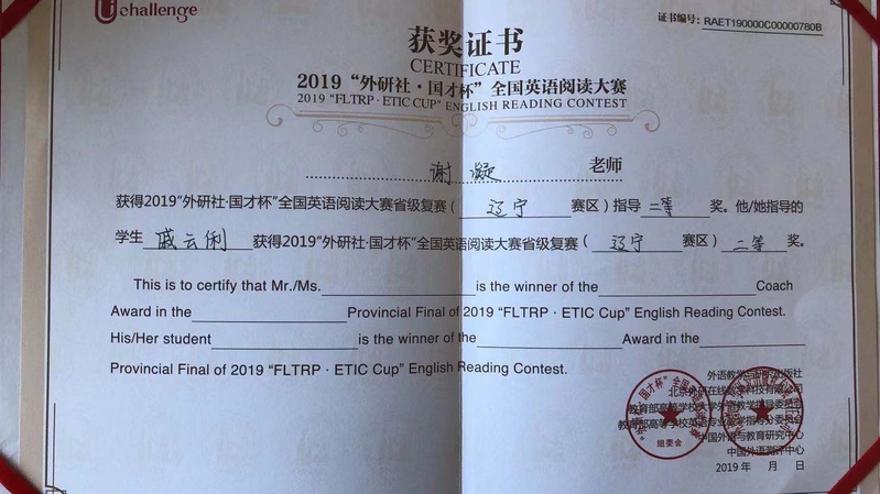 在2019年“外研社·国才杯”全国老员工英语挑战赛(辽宁省赛区复赛)的演讲、阅读、写作三项单项比赛中,云顶7610线路检测2017级翻译专业张一楠同学获得演讲赛一等奖、2016级英语专业肖萌同学获得演讲赛二等奖;2017级英语(师范)专业戚云俐同学获得阅读赛二等奖;2016级英语(师范)专业王国琪同学获得写作赛二等奖。