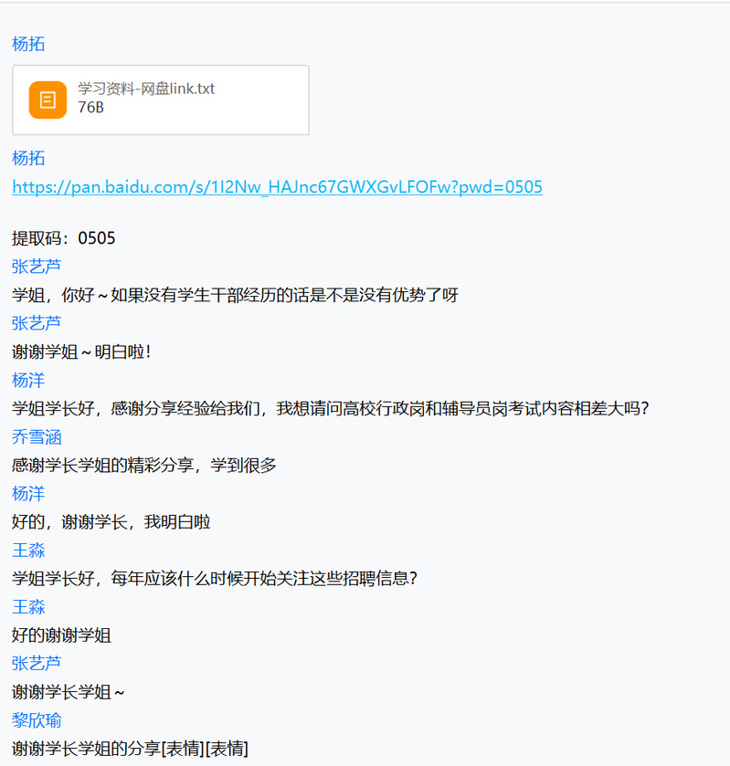 在最后的互动环节中,同学们围绕事业编的相关招聘要求向杨拓学长和高研学姐进一步请教,两位学长学姐非常耐心地回答了各位同学提出的问题。随着提问环节的结束,本次分享会也接近尾声。主持人刘子薇感谢了师兄师姐们能在百忙之中抽空给我们分享宝贵的考公考编经验,为我们解答心中的各种疑问,给我们的备考之路提供了极大的帮助,也激励我们在不断探索中,明确自己前进的方面,找到适合自己的发展道路,在未来的道路上拨云见日,一展鸿鹄之志。