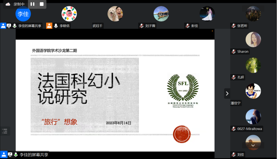 作为本次沙龙的主讲人,法语系李佳老师为师生带来了名为《法国科幻小说研究:“旅行”想象》的主题报告。李老师从科幻小说的起源、法国科幻小说发展史、法国科幻小说新趋势三个维度出发,系统梳理了科幻小说发展的脉络,同时结合具体的科幻小说与其改编的影视作品详尽阐释,将老师和同学一道代入了科幻的奇妙世界。李老师最后总结道,“旅行想象”作为科幻小说的原型,孕育了“空间旅行”、“时间旅行”、“技术想象”,以及常以描写到异邦或者跨时空旅行为主题的乌托邦”小说四大类别,并且揭示了科幻小说区别与奇幻文学的本质差别。同时,科幻小说将科学技术的发展与关于人类本质的哲学思考相结合,开启了“哲学性科技反思”的创作潮流。
