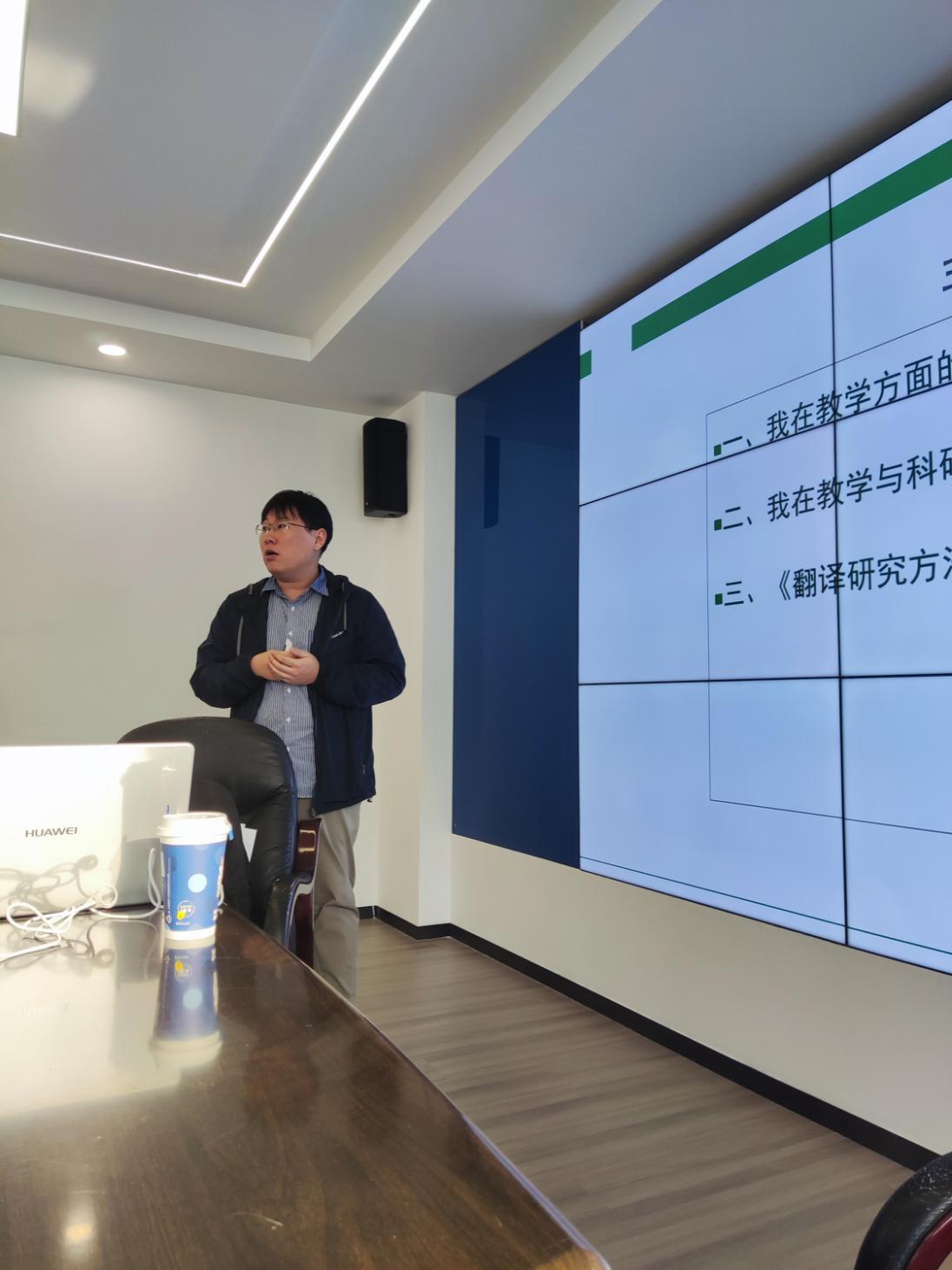 李晗佶老师进行了题为《关于教学与科研交融的思考——以<翻译研究方法>课程建设为例》的报告。李老师以自己的亲身经历,分享了青年教师在教学与科研领域遇到的问题,并以此为基点同与会师生介绍了自己关于教学和科研融合的思考。随后,李老师以为研究生所开设的《翻译研究方法》课程为例,详细介绍了课程的整体设计思路,以及教材选择、教学内容、教学方式等方面的制定与改进过程,并在此基础上展示了基于该课所产出的科研论文、教研项目与学术专著等成果,最后指出通过不断思考与实践,可以实现教学、教研和科研的有机融合,从而实现高校教师的全面发展。