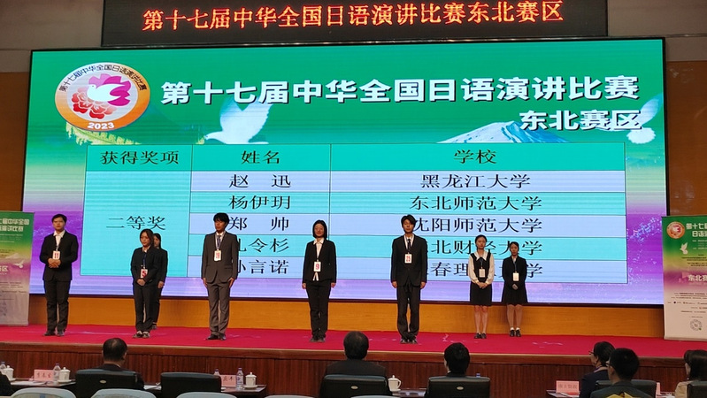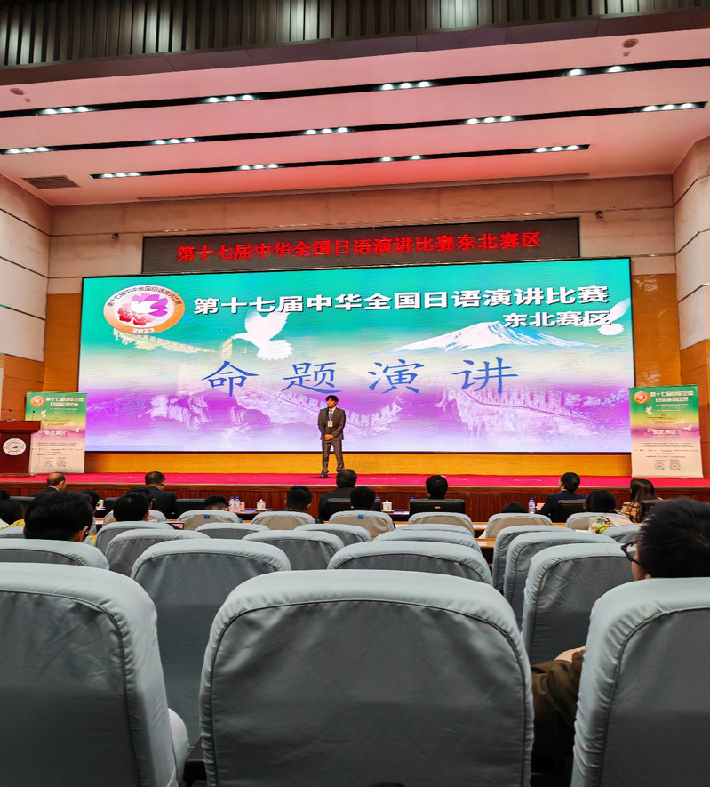 本次大赛分为命题演讲、即兴演讲两个环节。命题演讲的题目是“寄语中日和平友好条约缔结45周年”和“数字化转型与我们的生活”,即席演讲部分要求选手就现场提出的问题陈述自己的看法,准备时间为10秒钟。日语系四年级员工郑帅以出色的演讲内容、淡定的表现、流畅且自然的日语表达赢得了观众和评委的认可,获得第十七届中华全国日语演讲比赛东北赛区二等奖。本次大赛东北赛区共有28所高校参赛,包括吉林大学、哈尔滨工业大学、东北师范大学、东北大学、辽宁大学、黑龙江大学、大连外国语大学等高校。参赛选手多为高年级员工,高手云集。
